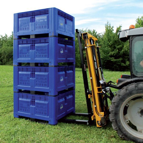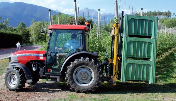 背負(fù)式叉車 是 為解決果園山地越野工況下 轉(zhuǎn)運(yùn)果筐和其它果園物資而研發(fā)的與果園拖拉機(jī)配合使用的果園轉(zhuǎn)運(yùn)裝備。叉車安裝在拖拉機(jī)后三點(diǎn)懸掛上,駕駛員通過操作液壓控制閥來控制叉車動(dòng)作,叉車具有舉升、側(cè)移、傾斜、鎖筐等功能,配備了舉升油缸2根、傾斜油缸1根、側(cè)移油缸1根、鎖緊油缸2根共計(jì)6根??梢淮闻e升多個(gè)果箱,方便果園果箱等物資的搬運(yùn),節(jié)省人力物力。果園用戶無需單獨(dú)購(gòu)買山地叉車,把該背負(fù)式叉車直接安裝到拖拉機(jī)上即可實(shí)現(xiàn)山地搬運(yùn)作業(yè),拖拉機(jī)可到之處都可以使用。特別適合果園采摘后的果箱的轉(zhuǎn)運(yùn)工作。